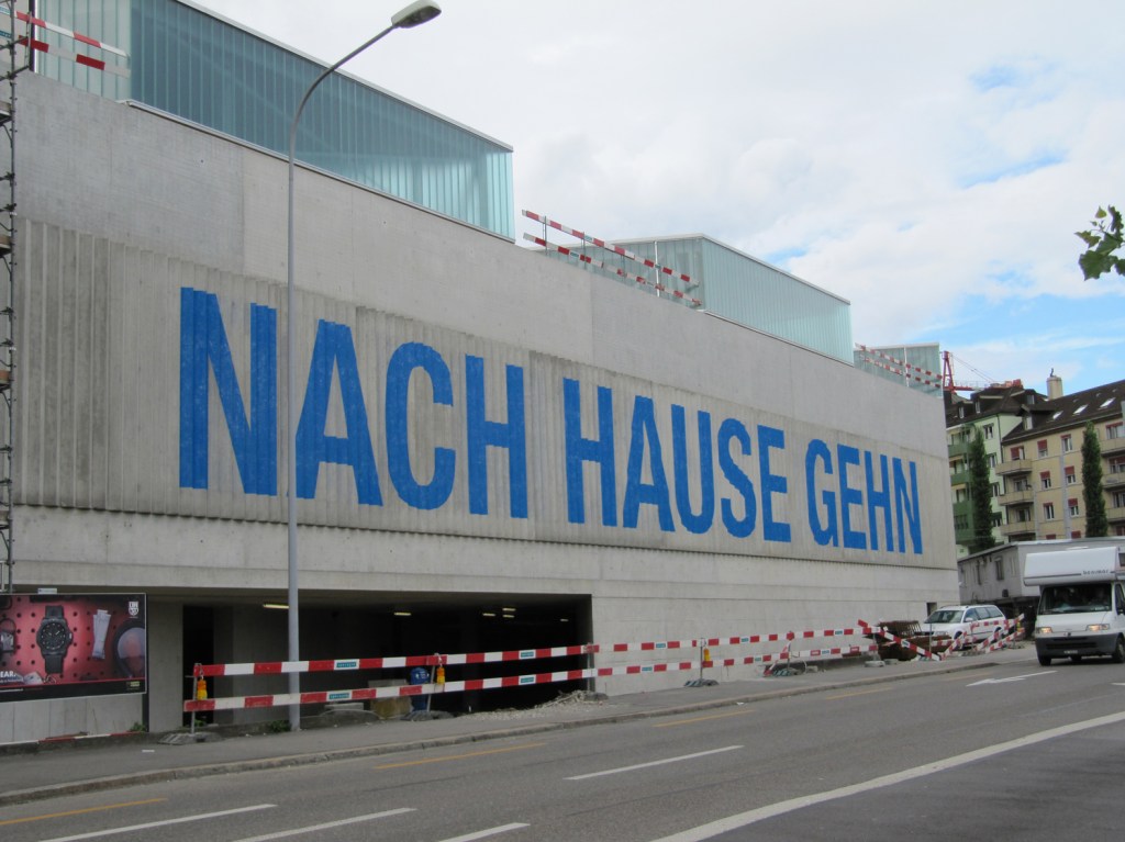 „Seit Juli 2011 prangt in grossen blauen Lettern ein Satz auf der Fassade des Erweiterungsbaus des Tramdepots Oerlikon: «Du musst jetzt nach Hause gehen». Diese Botschaft – die das Innenleben des Tramdepots nach aussen spiegelt – ist nicht als Ermahnung an die Besucherinnen und Besucher des unweit gelegenen Theater 11 oder der Züspa zu verstehen. Vielmehr dürfen sich die Trams angesprochen fühlen, die mit der Einfahrt in das Depot «nach Hause gehen» müssen. Die AutorenInnen dieser Botschaft sind Renata Grünenfelder und Hipp Mathis. Das KünstlerInnen-Duo, im Bereich audiovisuelle Produktionen tätig, hat sich mit dieser witzigen und schlichten Intervention in einem Wettbewerb Kunst und Bau des Amtes für Hochbauten im Jahre 2007 durchgesetzt. Die Gesamtkosten für diese Intervention belaufen sich auf rund 125 000 Franken.“