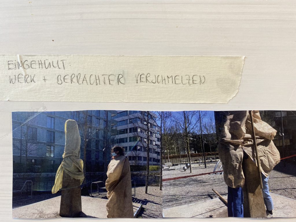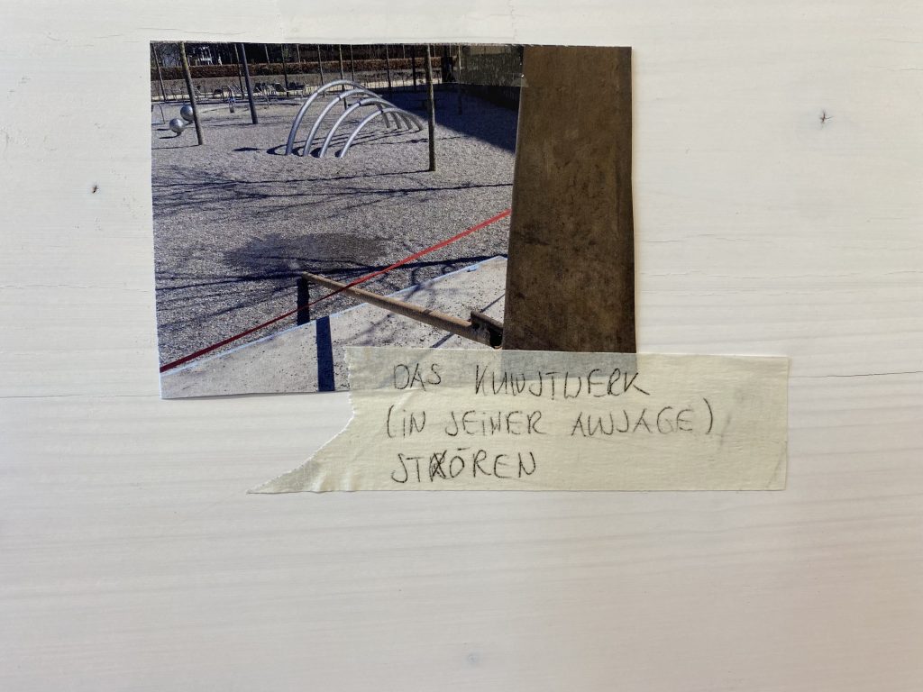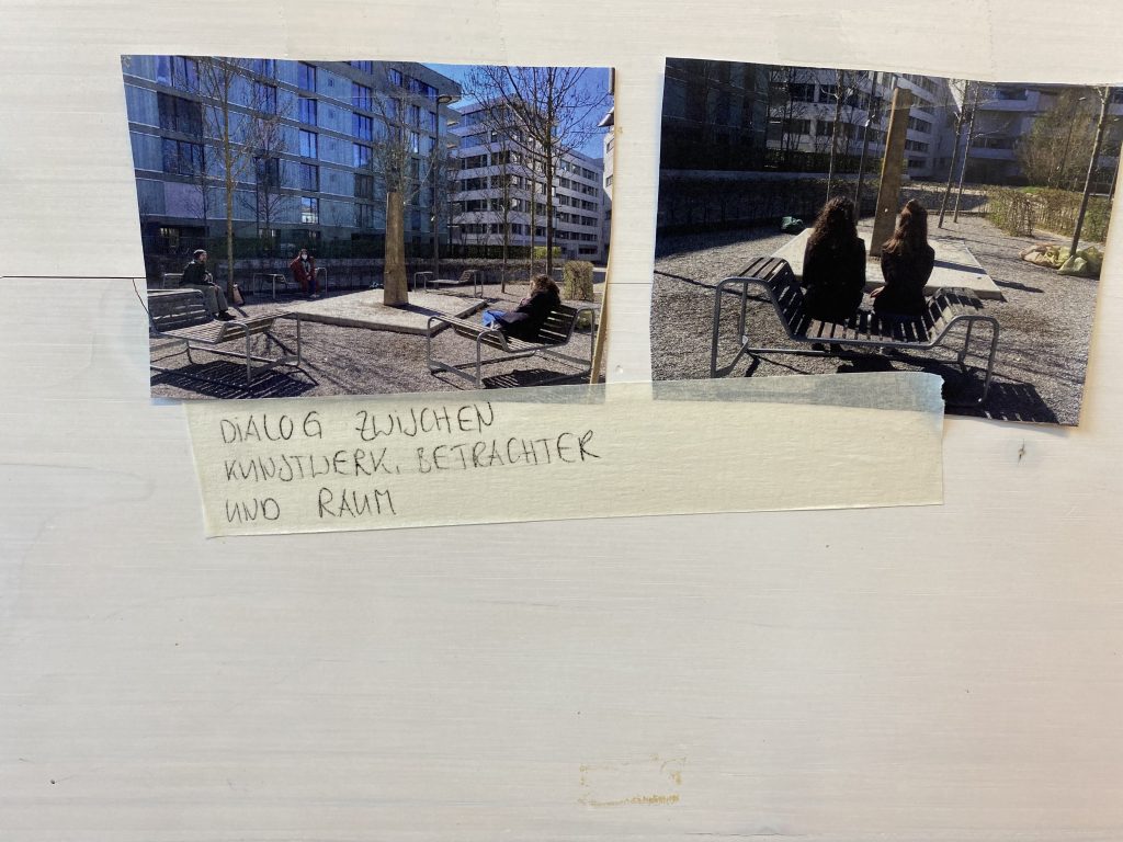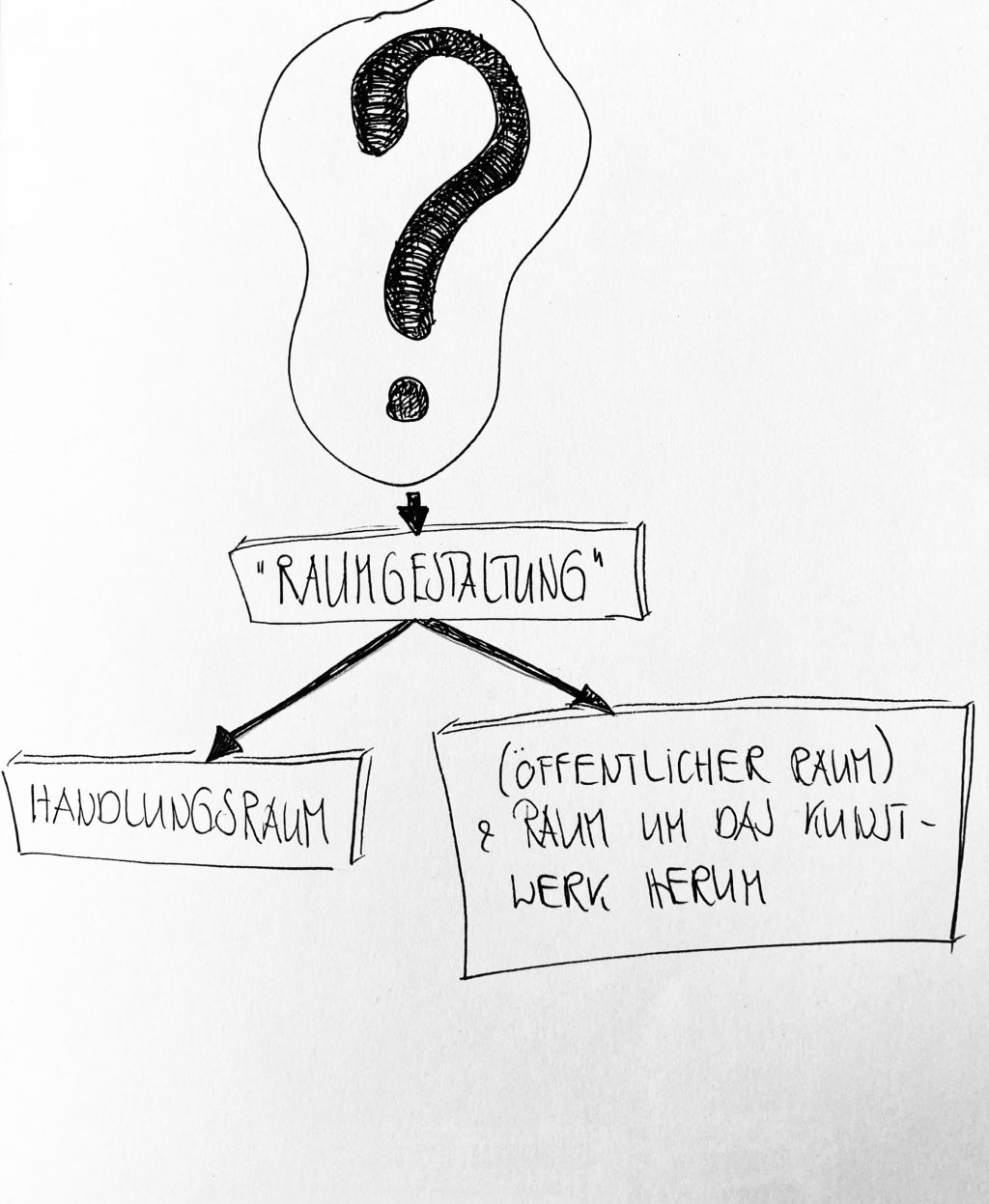 Wie kann der Ort um das Kunstwerk herum abgegrenzt werden. Evtl. braucht es gar nicht viel. Z.B. Pylonen, die man zur Verkehrsregelung braucht. Oder Abgrenzungen, die man in Schwimmbädern braucht, etc.
