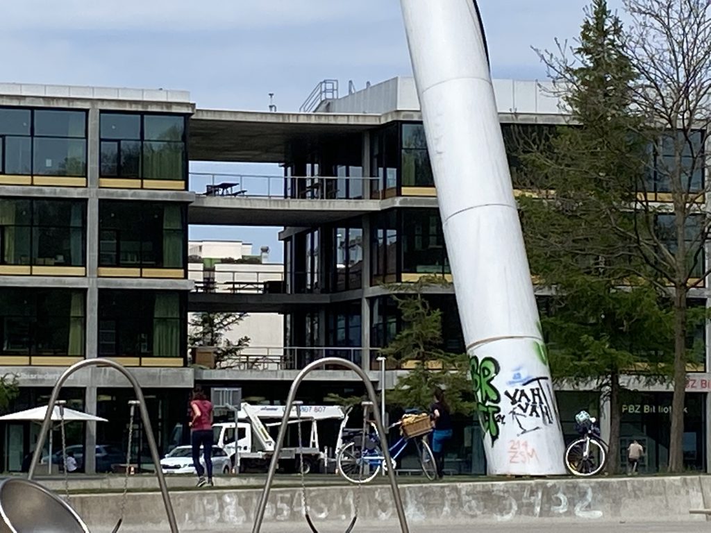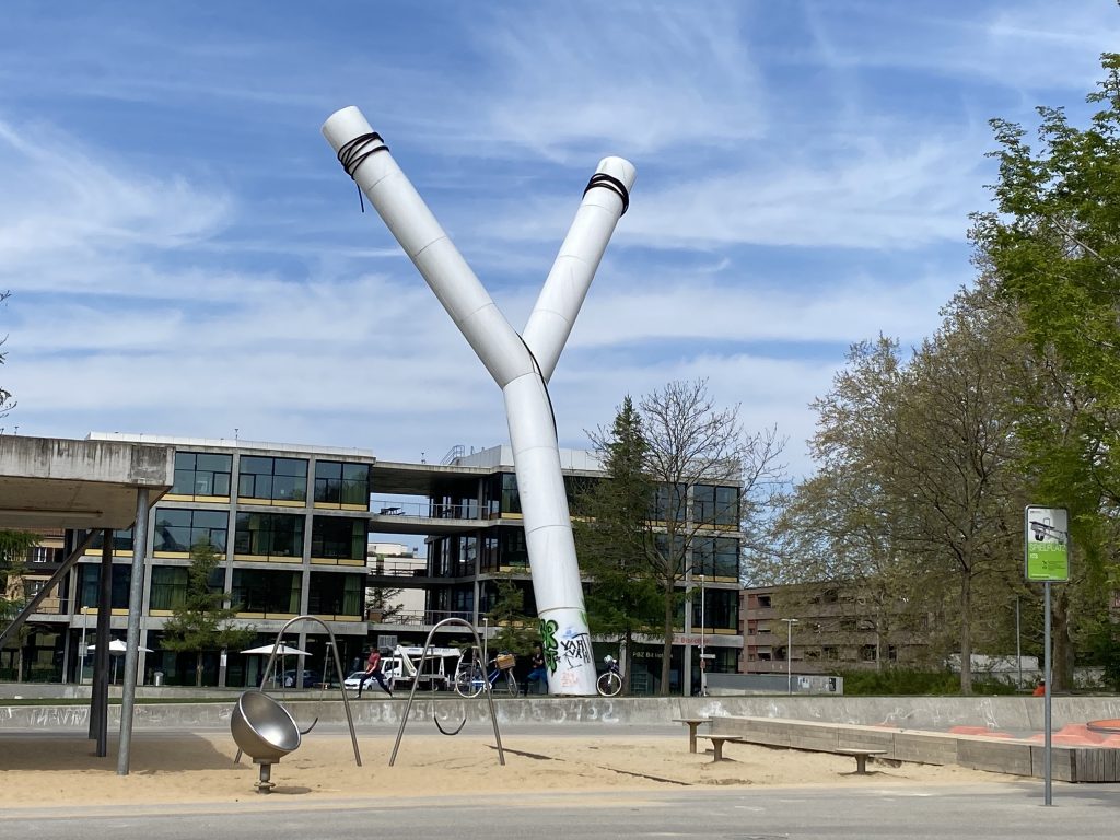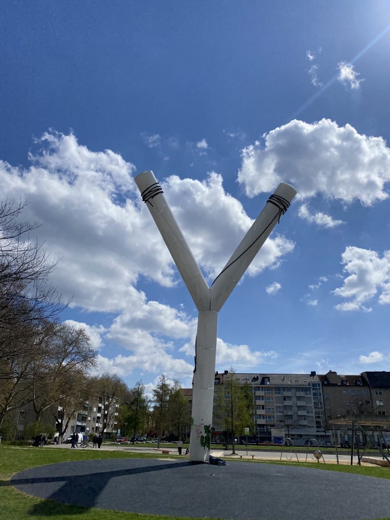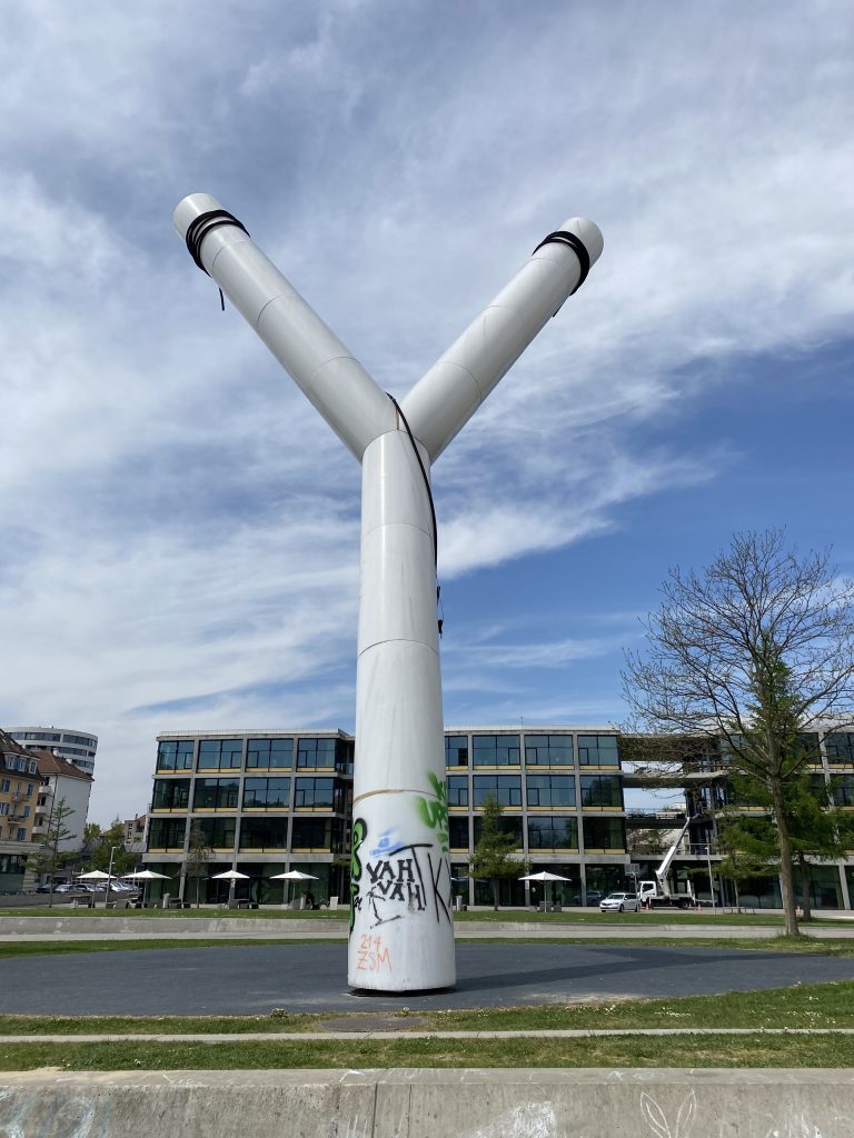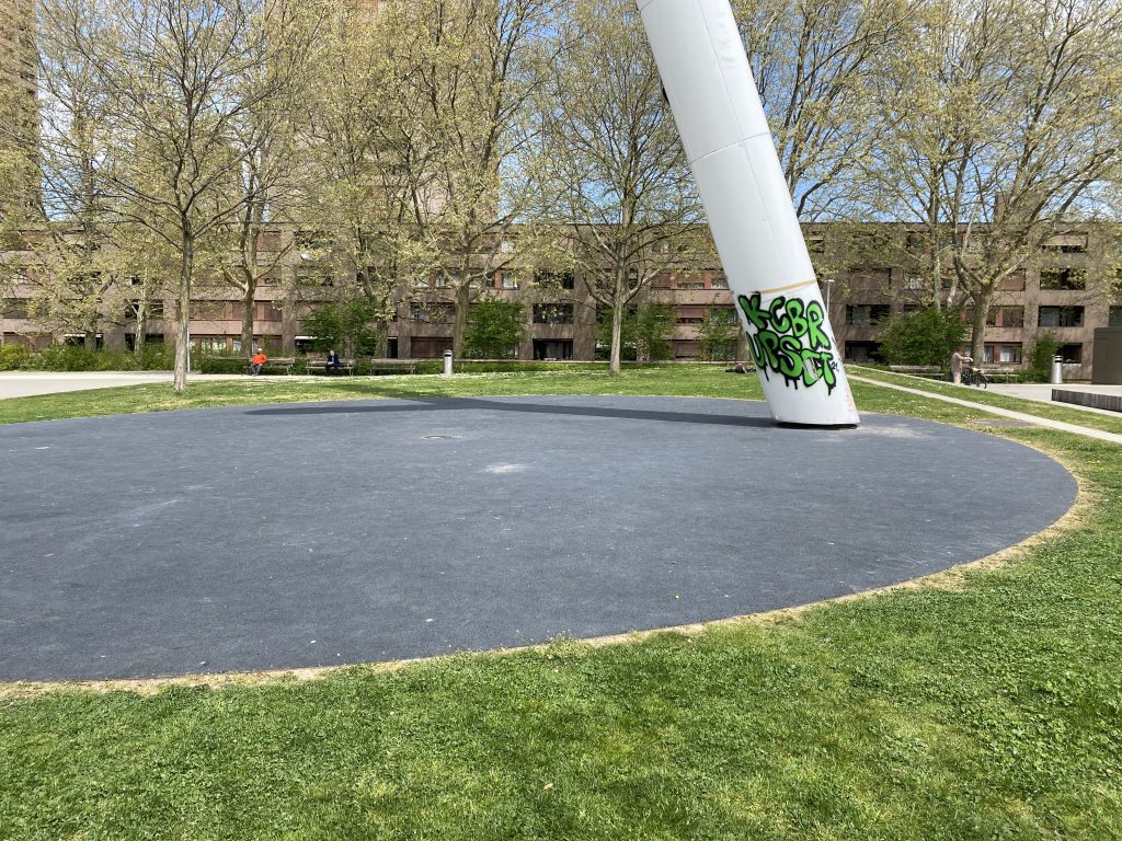 - Unten am Kunstwerk hat es einen schwarzen, ovalförmigen Hartplatz. Ich nehme an, aus Sicherheitsgründen, da man auf dem Y grundsätzlich schaukeln kann.