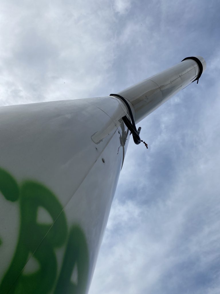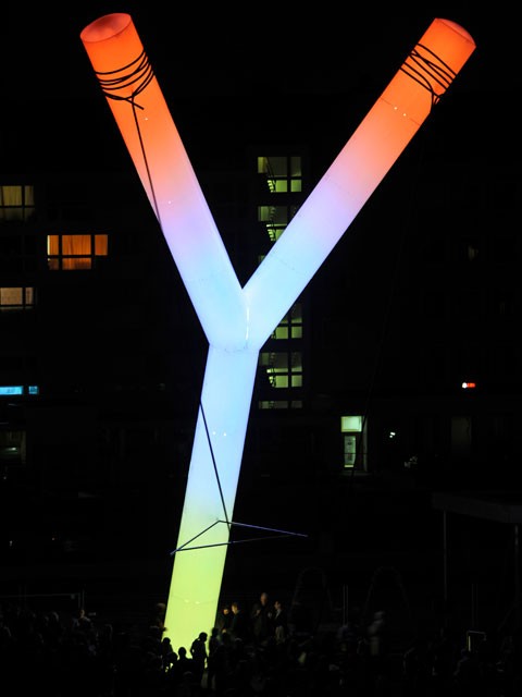 Skulptur aus Stahlrohr, Leuchtenden, Plexiglas, Stahlseil, Aluminium, Kunststoff, 15 Meter hoch
