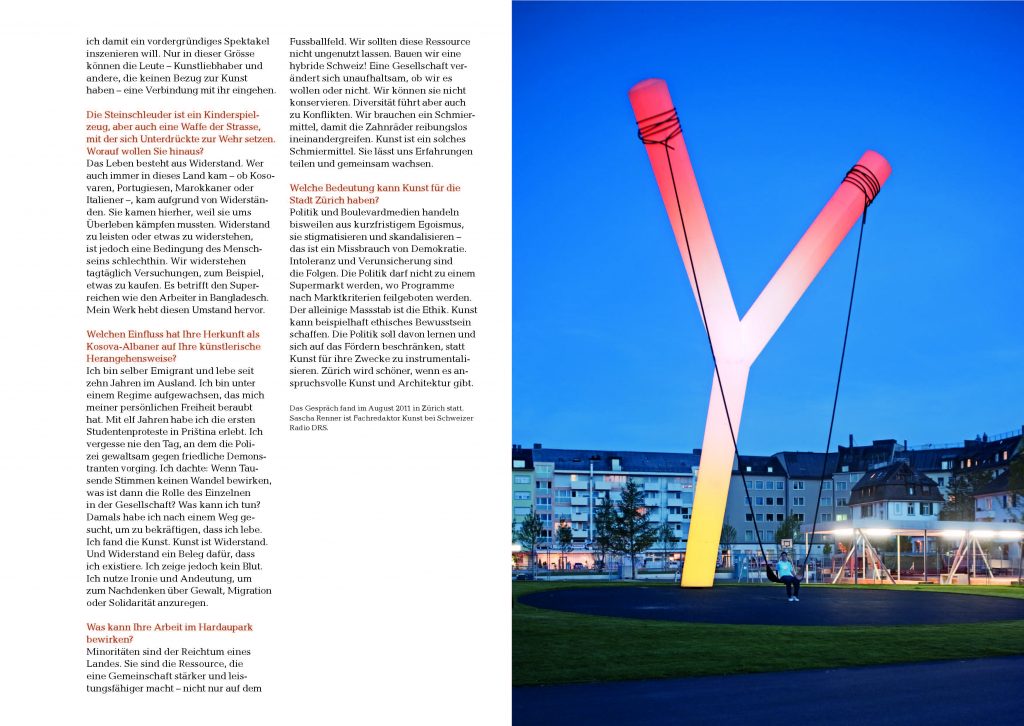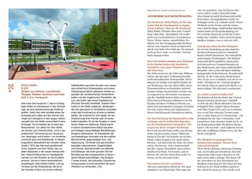 Xhafa macht in seiner künstlerischen Arbeit seit jeher auf Anliegen benachteiligter Bevölkerungsgruppen aufmerksam. Er thematisiert die wechselseitigen Vorurteile und die subtilen Mechanismen gegenseitiger Aus- und Abgrenzung. Territorial und geschichtlich geprägte Lebensformen, Zugehörigkeit und Heimat, Gemeinschaft und Identität sind Belange, die einen grossen Teil der Bevölkerung des Hardquartiers in besonderem Masse beschäftigen
