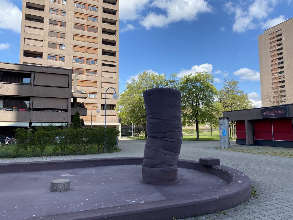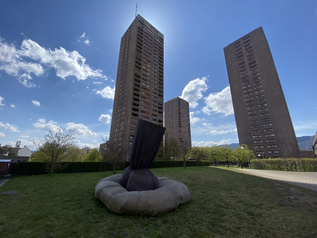 - aufragende Form will die Monumentalität der Häuser auffangen und auf menschliches Mass bringen