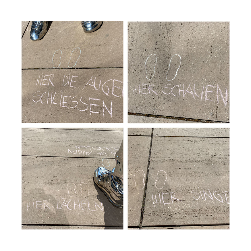 - Das eigene Körperempfinden in Bezug zu setzen auf das Kunstwerk (in seiner Körperlichkeit) und den (öffentlichen) Raum (wo Das Kunstwerk sich befindet). D.h. diesbezüglich soll die Wahrnehmung geschärft werden.