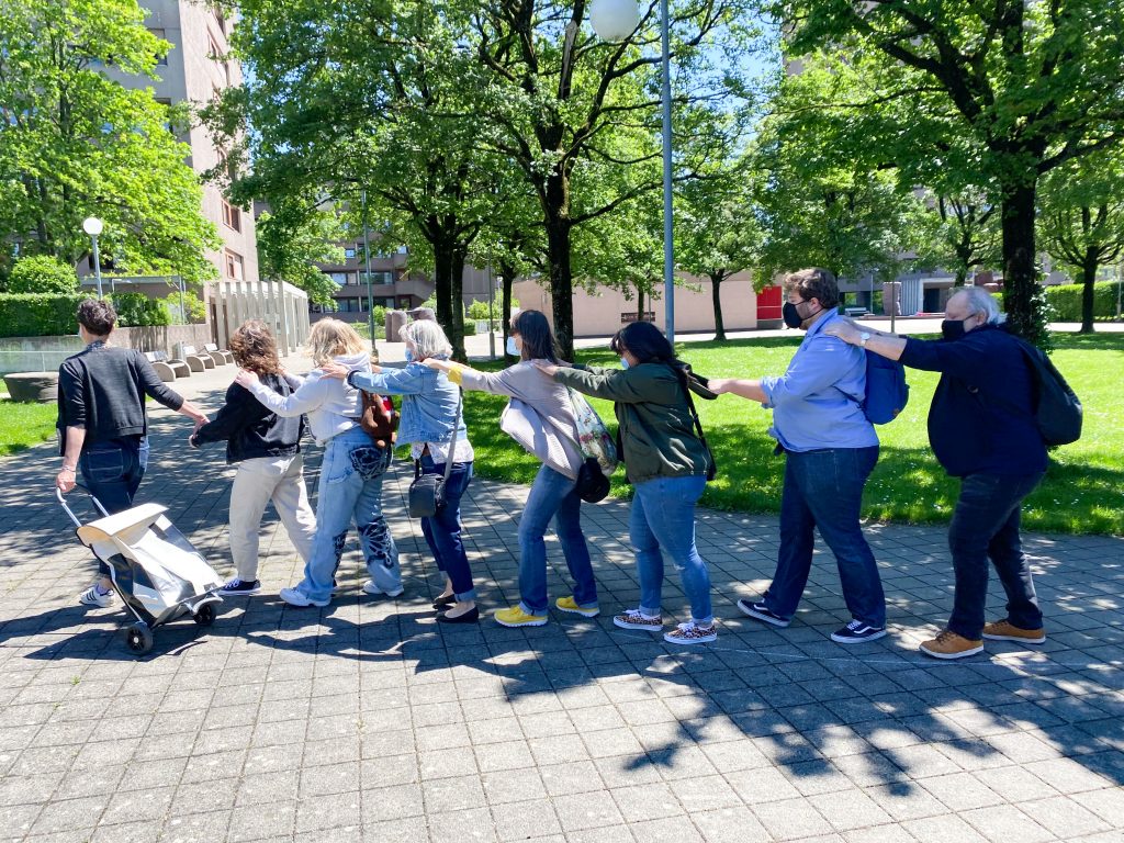 Es schien den Teilnehmenden schwer zu fallen, den öffentlichen Raum bewusst wahrzunehmen. Es wurde zurückgemeldet, dass der Raum dann am meisten bewusst war, als die Gruppe von vielen Wohnhäusern umgeben war. Das vermittelte bei einigen das Gefühl, Eindringling zu sein. Bei der vierten Station spürte ich bei den Besucherinnen und Besuchern eine gewisse Hemmschwelle, in einem öffentlichen Park die Körperhaltung des Kunstwerks einzunehmen. Ein kurzer Austausch über diese Gefühle brachte die Hemmungen bei den meisten zum Schwinden. Beide Empfindungen können keiner Altersgruppe zugeschrieben werden.