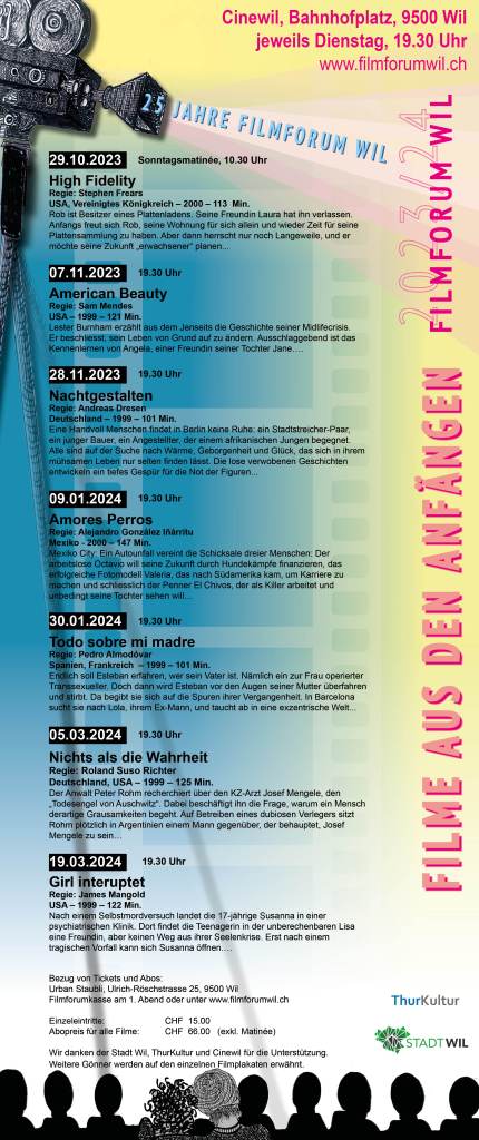 Das Filmforum Wil ist ein Verein, der es sich zum Ziel gesetzt hat, dem Publikum besondere Filme zu präsentieren. Die Filme werden jedes Jahr zu einem übergeordneten Thema auserkoren. Im Jahr 2023 feierte das Filmforum Wil ihr 20jähriges Jubiläum und gestaltete das Erscheinungsbild der Plakate neu.